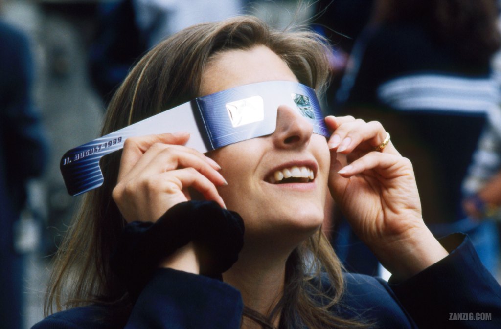 AUGUST 1999 – A woman wearing dedicated protection glasses watches the approaching eclipse of the sun in Unterhaching near Munich, Germany. © Mark Zanzig/zanzig.com