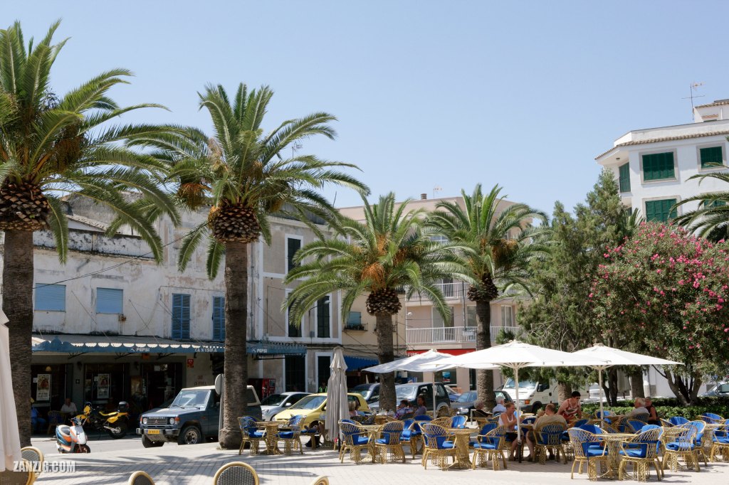 This photo shows the Plaça Espanya during the midday heat when most people simply have their Siesta or are at the beach. Just a few tourists sit in the outside area of the café Ca N’Usola and enjoy the shadow provided by the large umbrellas.