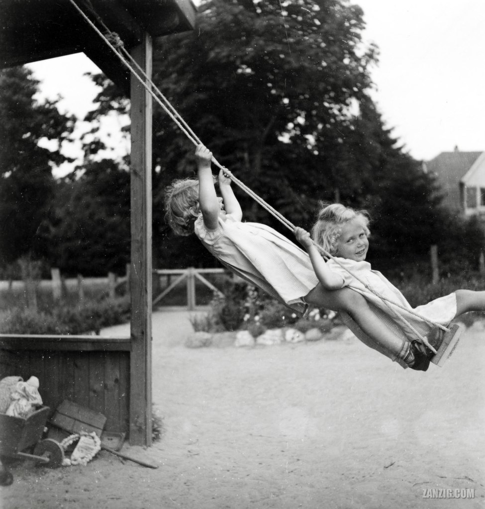 1947 – On a bright summer day, two young girls rock a swing in the backyard of their home in Malente-Gremsmühlen, Germany. Scan © Mark Zanzig/zanzig.com