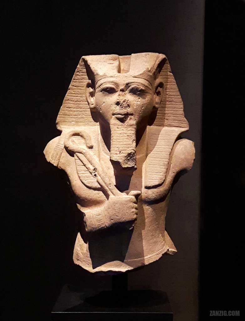 This exhibt has impressed me the most: The upper part of a seated statue of Ramses II who holds a crook and a flail. He belonged to the 19th Dynasty, and this is the original sandstone exhibt from c. 1240 B.C.