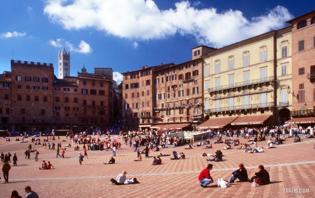 AUGUST 2000 – People enjoy their lunch break at the Piazza del Campo in Siena, Italy. Photo © Mark Zanzig/zanzig.com