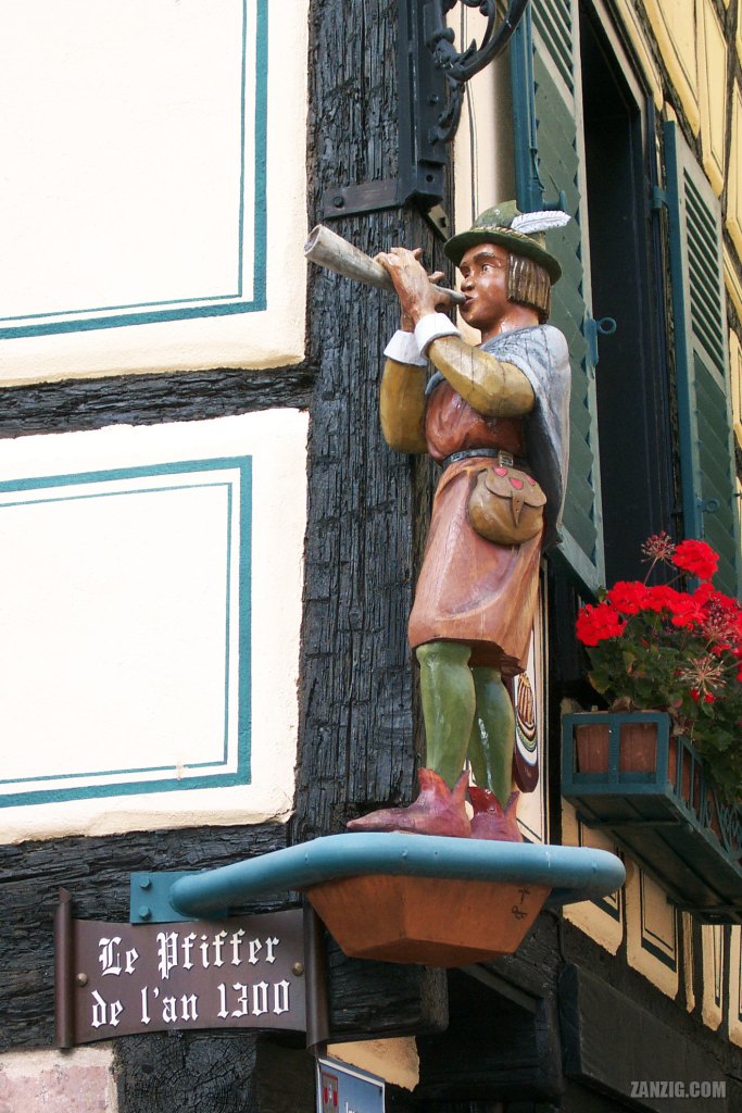SEPTEMBER 2001 – A wooden statue at the corner of a house shows a man playing the flute in the year 1300 in the town of Ribeauvillé in Alsace, France. © Mark Zanzig/zanzig.com
