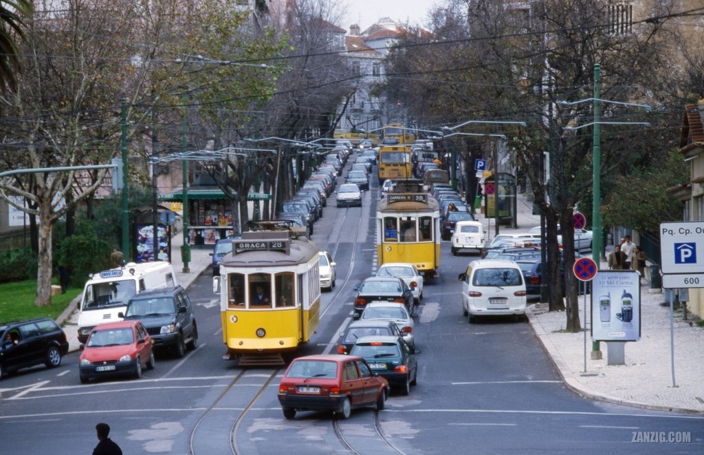 2000 – View along the R. Domingos Sequeira in Lisbon, Portugal, with two trains of the historical tram line 28E. © Mark Zanzig/zanzig.com