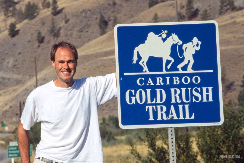 AUGUST 2002 – Mark Zanzig stands next to a road sign marking the Cariboo Gold Rush Trail in British Columbia, Canada. © Petra Zanzig/zanzig.com