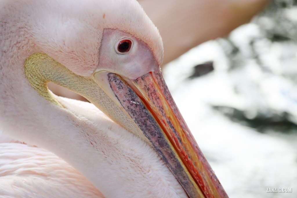AUGUST 2023 – Close-up of a white pelican (Pelecanus onocrotalus) at the Hannover Adventure Zoo in Germany. Photo © Mark Zanzig/zanzig.com