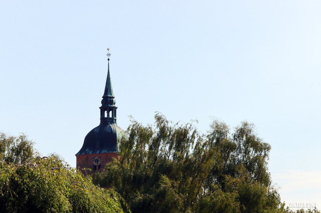 AUGUST 2023 – On a clear afternoon, the tower of church St. Nikolai lurks through the trees in the neighborhood in Burg auf Fehmarn, Germany. Photo © Mark Zanzig/zanzig.com
