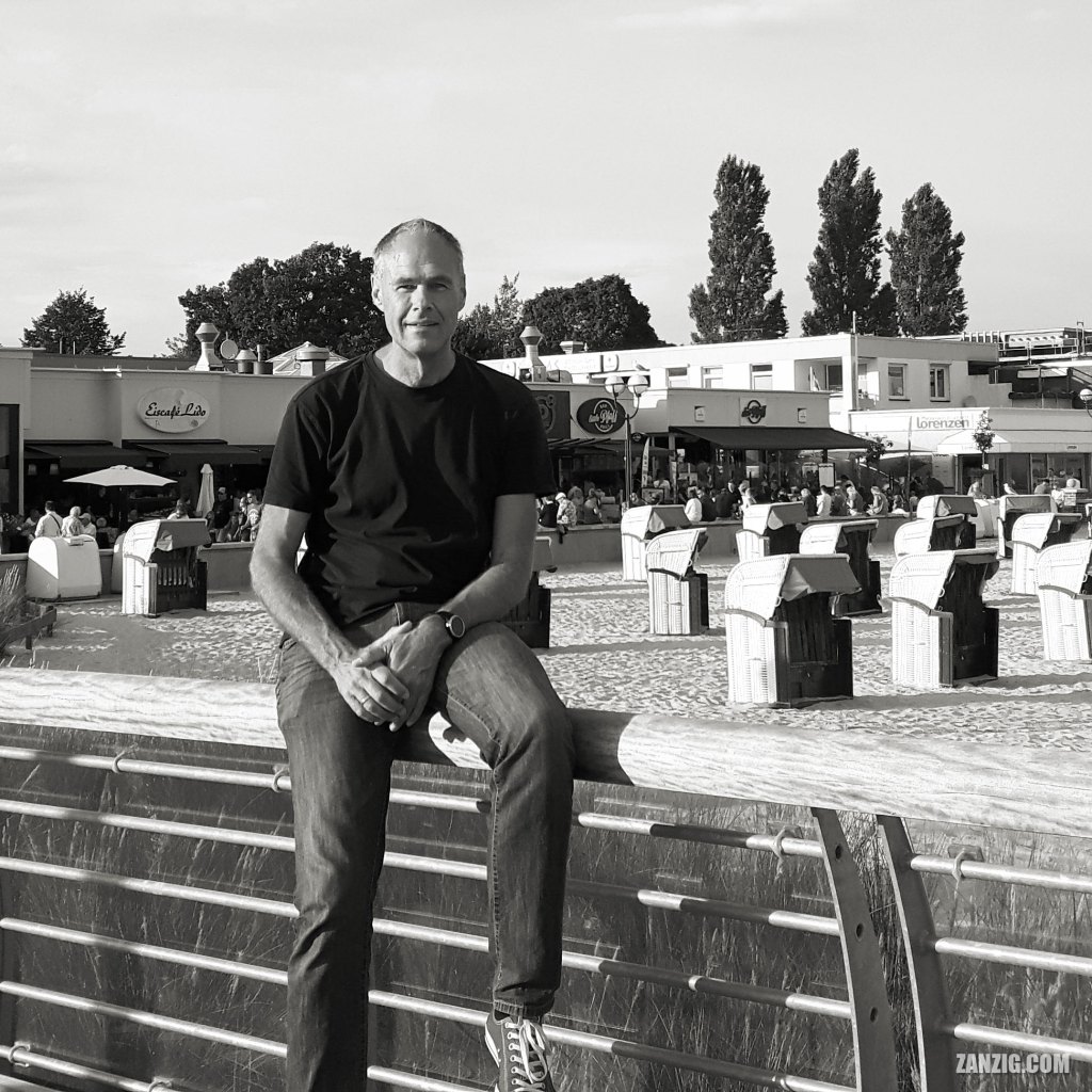 AUGUST 2023 – Mark Zanzig poses for the photographer at the pier of Grömitz, Germany. The street next to the beach is busy with people. Photo © Petra Zanzig/zanzig.com