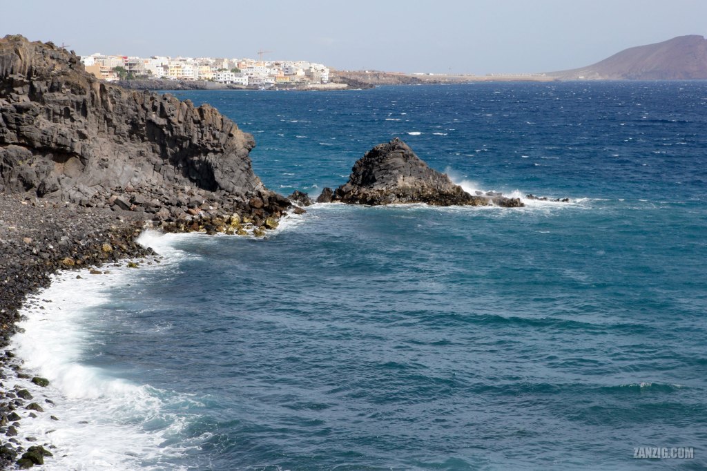 My photo shows a view from that trail towards east, along the rugged coastline. In the back, La Montaña Roja (‘The Red Mountain’) can be seen, which is part of a special nature reserve. The lack of bright white sand and plants or trees reduces the color set and creates a bizarre impression that adds to the fascination. The strong wind is clearly visible on the surface of the water.