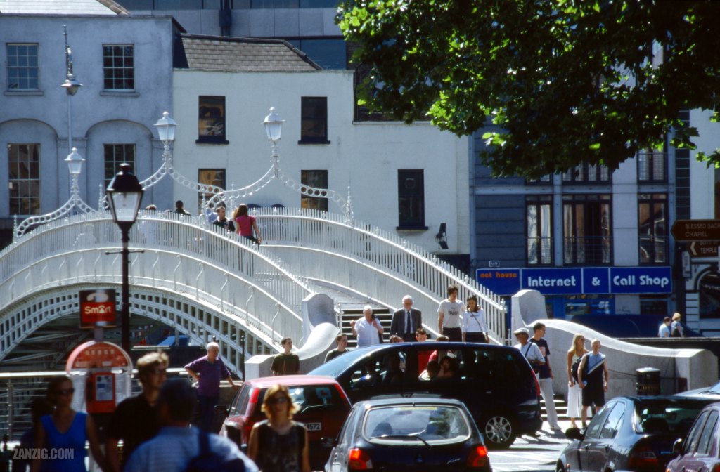 AUGUST 2003 – People cross the river Liffey on the historic Ha’penny bridge in Dublin, Ireland. © Mark Zanzig/zanzig.com