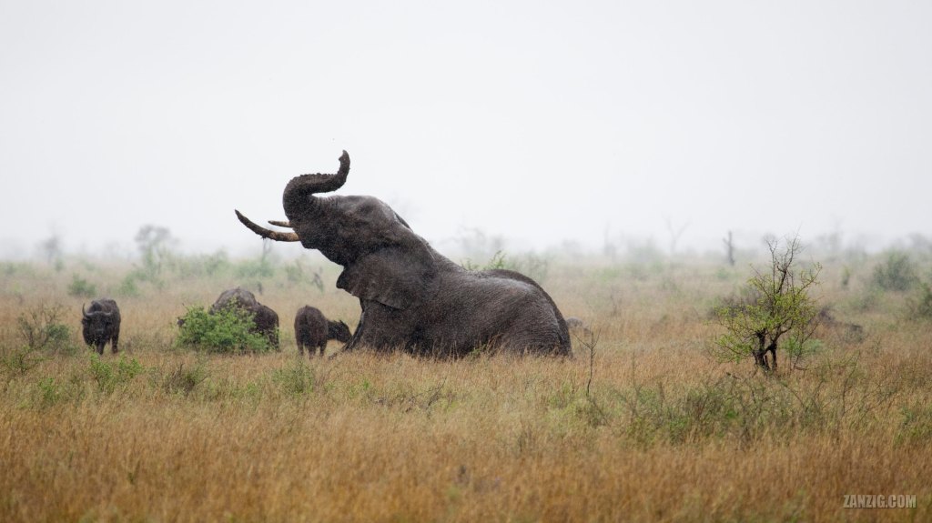 NOVEMBER 2011 – During heavy rain, an elephant rolls in the wet grass of the Kruger National Park, South Africa. © Mark Zanzig/zanzig.com