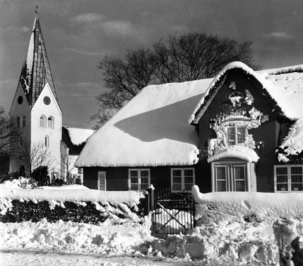 1961 – The St. Clemens church in Nebel on the island of Amrum in Germany on a beautiful day in winter. Photo © Kurt Riehme, Scan by Mark Zanzig/zanzig.com