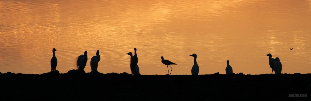 NOVEMBER 2006 – During sunset, several birds relax at the waterhole at the Okaukuejo rest camp in the Etosha National Park, Namibia. © Mark Zanzig/zanzig.com