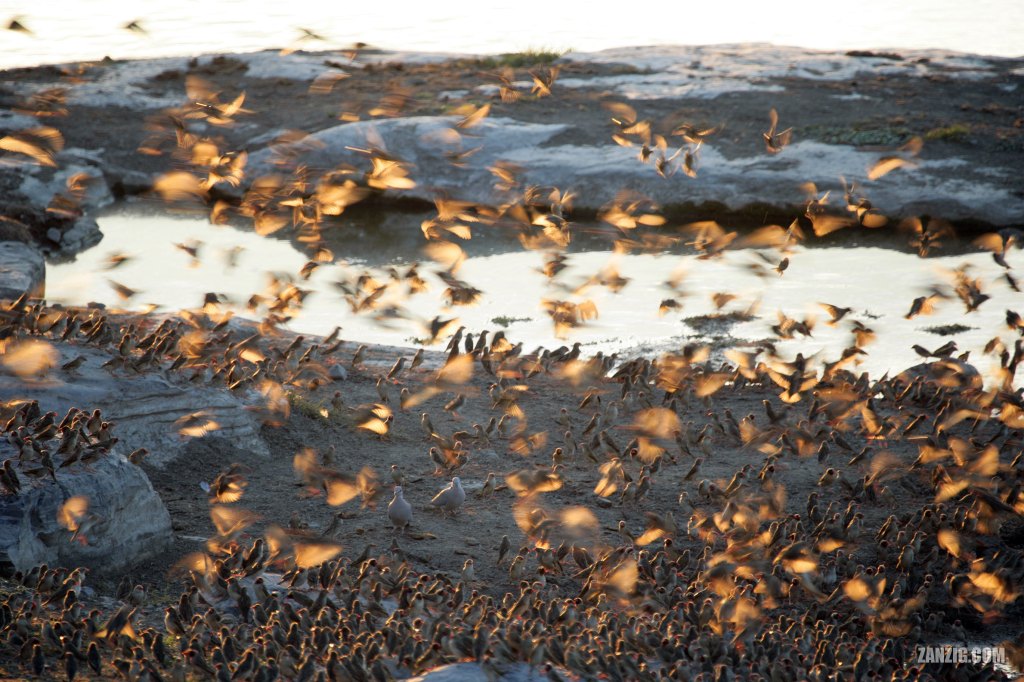 NOVEMBER 2006 – Countless Red-billed Quelea take a stop for a drink at the Moringa Waterhole in the Etosha National Park, Namibia. © Mark Zanzig/zanzig.com