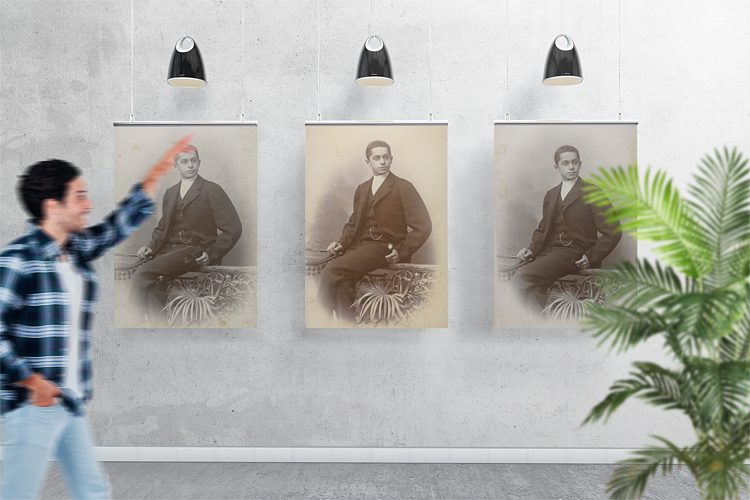It is interesting to see that the prints have been developed differently already back in 1896. Clear hints are the oval surrounding Hans which are different in each print. The center image had probably been in a frame for a longer period because the colors have faded more than its two neighbors. What’s more, the center image has been damaged where Hans’ left thumb hooks into the pockets of his trousers. (Something had hit the surface of the print here, leaving a white spot and a tiny dent.) And the right image shows several scratches.