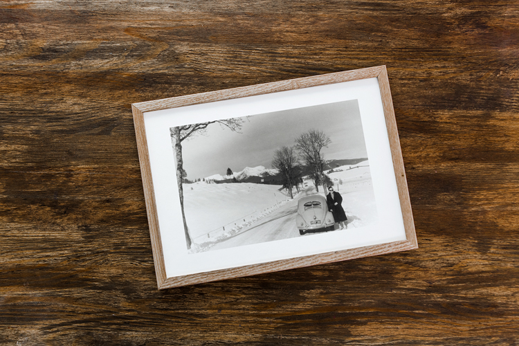 I found this photo in the family archive, taken on New Years Day 1953 between Mittenwald and Garmisch in the Bavarian Alps in Germany. Apparently, there had been heavy snow the days before, and the couple had stopped their Volkswagen Beetle next to the road to take this photo.