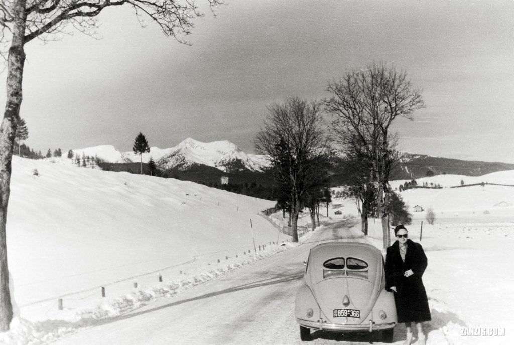 JANUARY 1953 – A Volkswagen Beetle has been parked next to a snow-covered road between Mittenwald and Garmisch in Germany. Scan © Mark Zanzig/zanzig.com