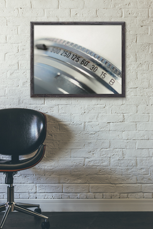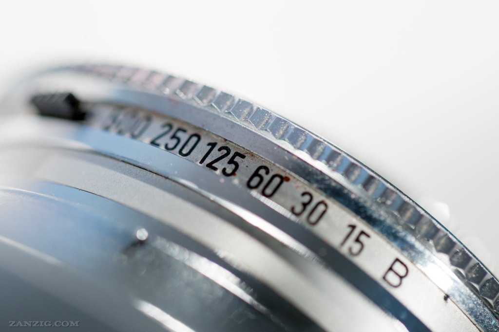 For this article I shot several photos of the camera, and here is one them – a close-up of the exposure time ring on the lens. Thanks to the large aperture of f/2.8 of my Canon Macro lens, I could focus on the 125 setting and blur the rest. You can almost feel the metallic robustness that has survived six decades by now.
