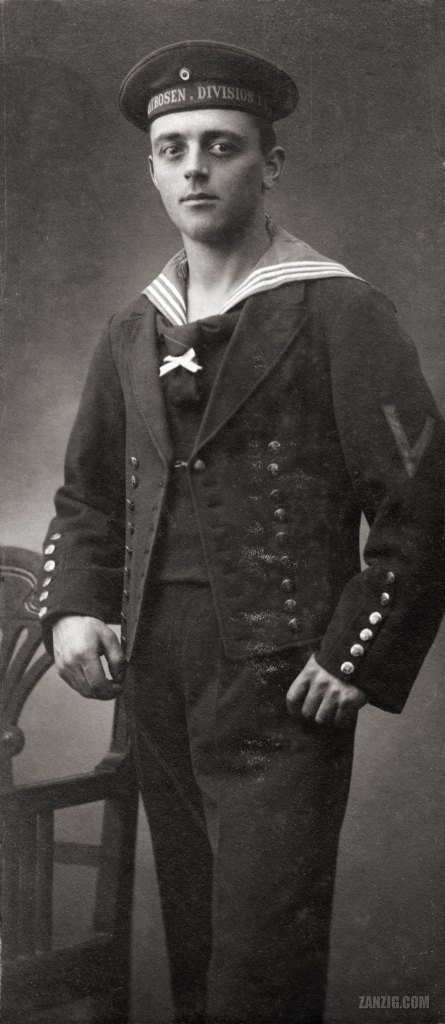 Looking at Mr. Köhler, he wears his uniform with innocent pride, so I guess the image had been shot before World War I, or in its early days. His cap band says Matrosendivision I which were the sailors who would staff the ships when a war would break out.