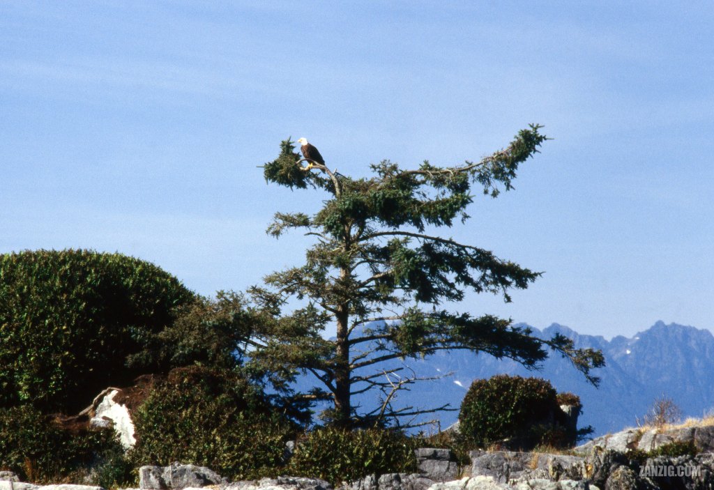 AUGUST 2002 – A Bald Eagle (Haliaeetus leucocephalus) sits on top of a tree near Tofino on Vancouver Island, British Columbia. © Mark Zanzig/zanzig.com