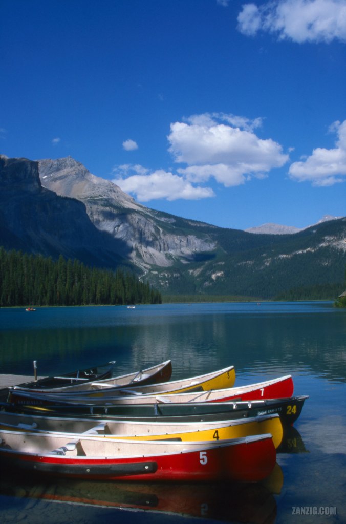 AUGUST 2002 – Colorful canoes have been tied to a pier at Emerald Lake, situated within Canada’s Yoho National Park. © Mark Zanzig/zanzig.com