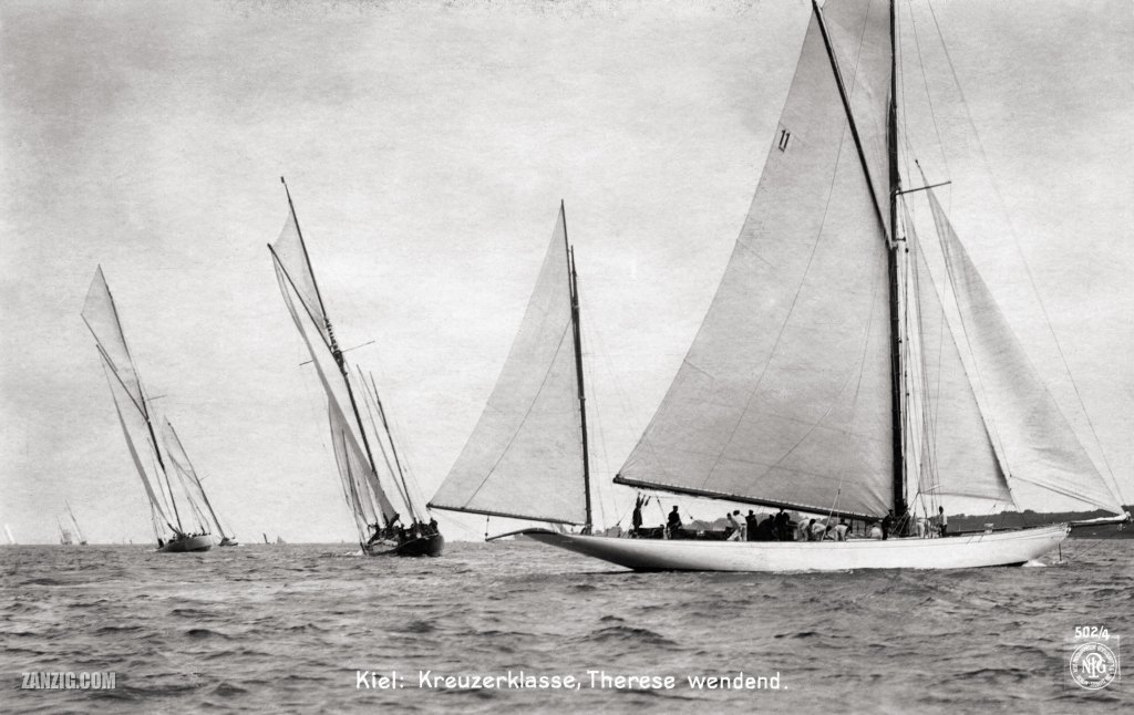 The picture shows the sailing yacht Therese while taking a turn. The yacht is a so-called Yawl or a 1½ mast yacht. That’s because the mizzenmast is typically just half the size of the main mast. The large sails and relatively short waterline makes this type pretty fast. And if there’s decent wind the ships will tilt significantly. This is visible in the photo by looking at the yachts that are ahead of the Therese already, heading for the open Baltic Sea. If you want to dive into the exciting times of early modern yachting, take a look at this website. (The Therese is mentioned several times as well.)