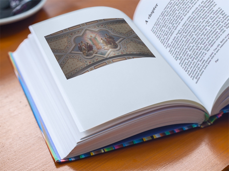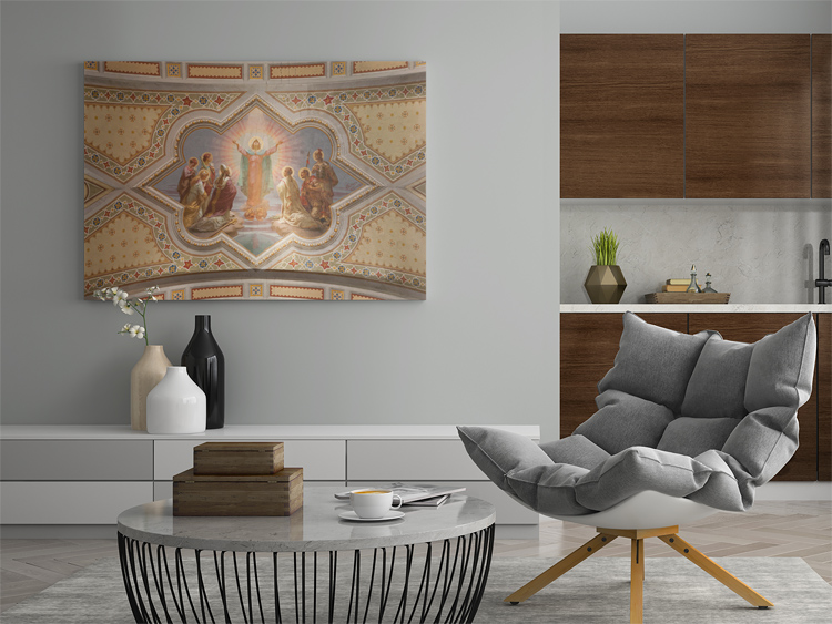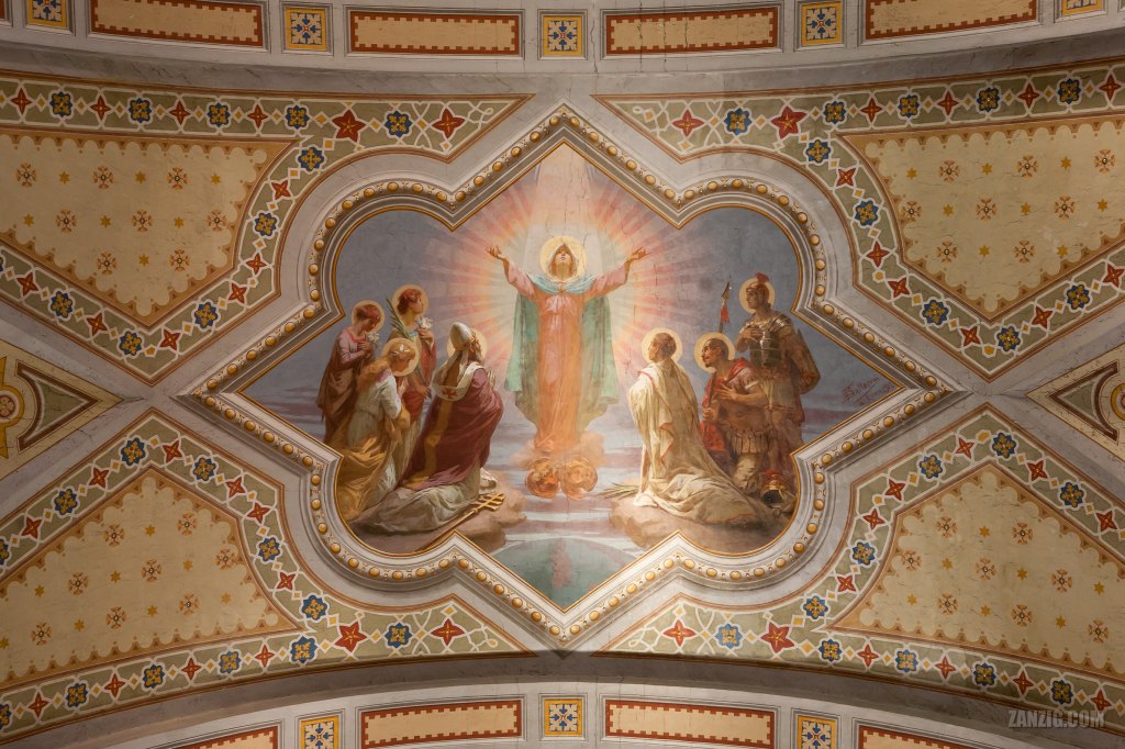 I looked up to the ceiling and discovered this painting signed Ballerini da Roma, 1912. This apparently refers to Professor Ballerini of Ancona who created most of the internal pictorial decoration in 1912. I took an image right beneath the painting, looking straight up. I adore the symmetry and colors. The light beam in the center, by the way, was present at the time of shooting and has not been added with Photoshop.
