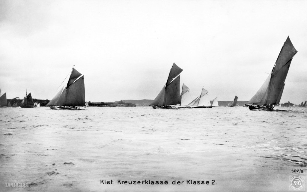The picture shows the racing field of cruiser yachts (class 2) as they speed across the Kieler Förde. The decent wind has tilted the ships significantly. A beautiful view, even more so if you are into sailing. (If you want to dive into the exciting times of early modern yachting, take a look at this website.)