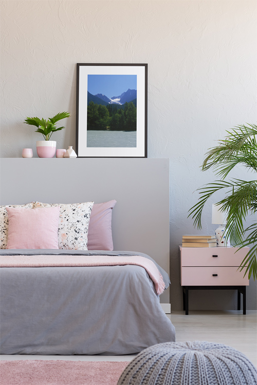 This image shows a view across Bella Coola River into the nearby mountain range. You can almost feel the clear air and the cold, pure water.
