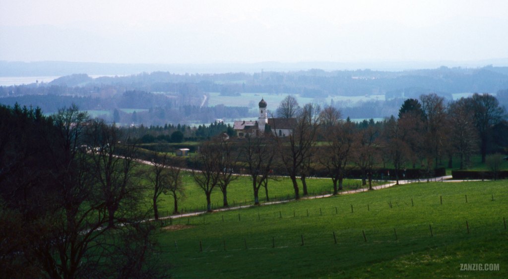 2003 – The church St. Nikolaus in Oberzeismering near Tutzing, Bavaria, seen from the Ilkahöhe on a sunny day in spring. © Mark Zanzig/zanzig.com