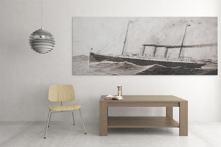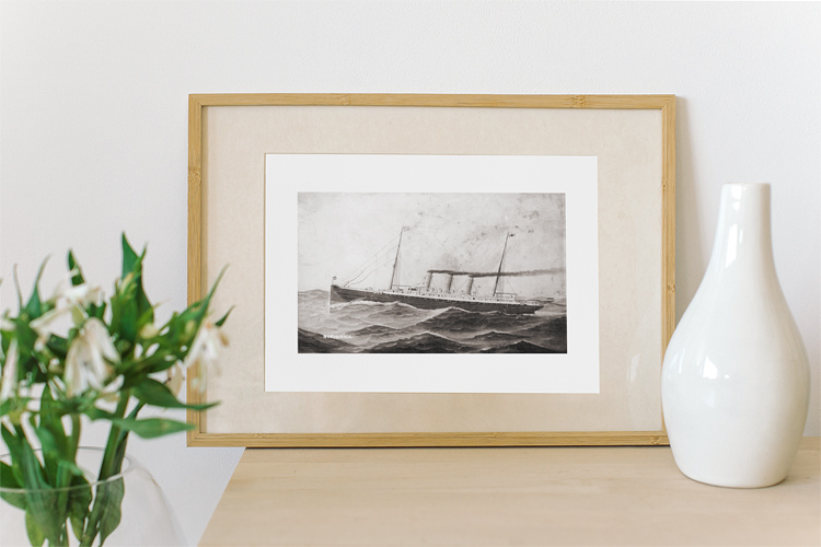 This cabinet photo shows the reproduction of painting of the SS Normannia, most likely published by W. Sander & Sohn in Geestemünde, Germany, who had specialized in publishing photos with paintings of ships. Their images have a distinct style, usually showing the vessel in harsh weather conditions. This does not come as a surprise, because crossing the Atlantic Ocean was not for the faint hearted back then.