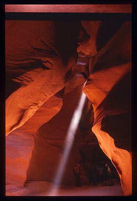 SEPTEMBER 2003 – A TV crew films the beauty of a sun beam that illuminates the red and purple walls inside Antelope Canyon in Arizona. Photo © by Mark Zanzig/zanzig.com