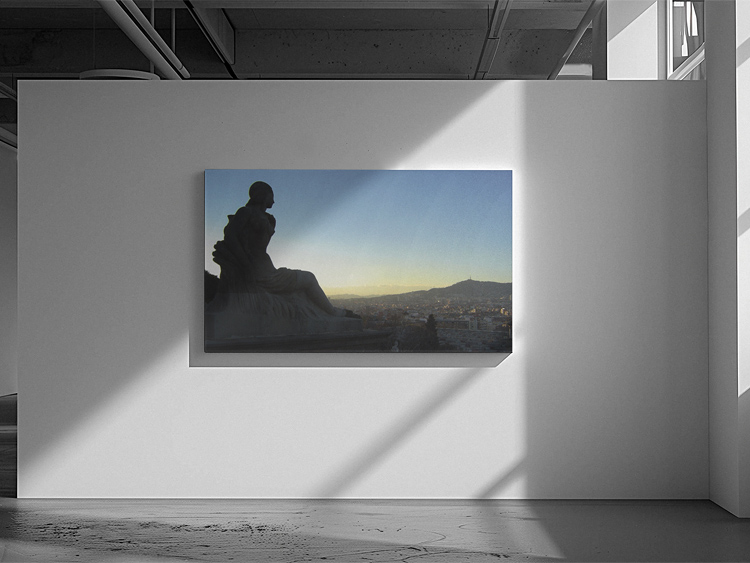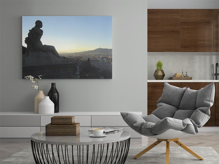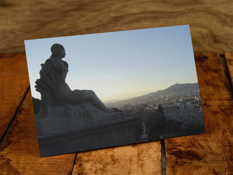 Before entering the tour bus at the Palau Nacional, I took this terrific shot from the Mirador Barcelona right in front of the museum, overlooking the fairgrounds and large parts of the city. The last sunlight was streaming in from the left, and I deliberately placed the sculpture in the frame to cover the setting sun. The result is a very dominant sculpture with a harsh contrast – almost just a sharp outline – against a blue sky and some golden sunlight in the back.