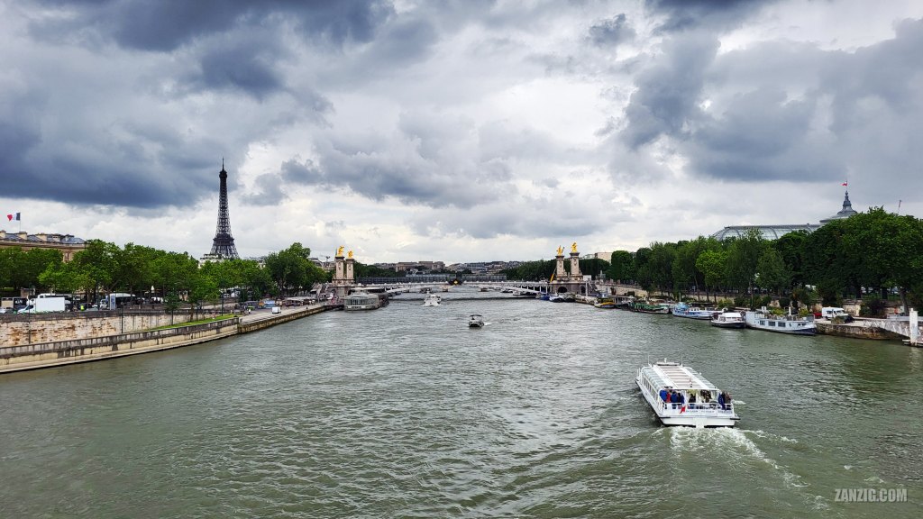 MAY 2024 – Dramatic clouds hover over Paris, France, while an excursion boat approaches Pont Alexandre III on the river Seine. Photo © Mark Zanzig/zanzig.com