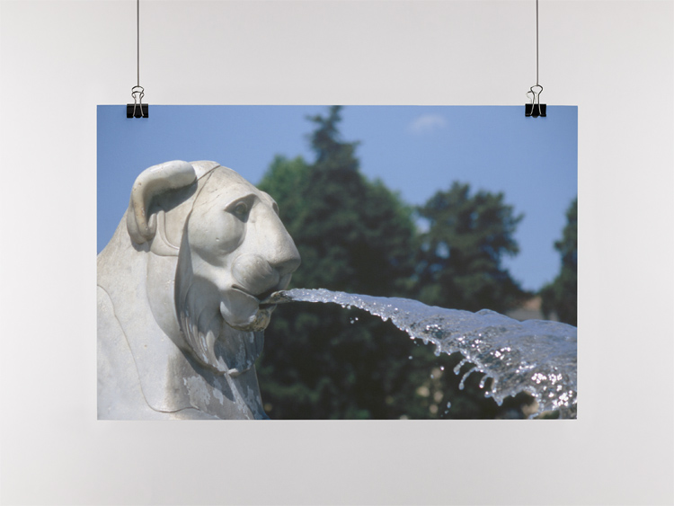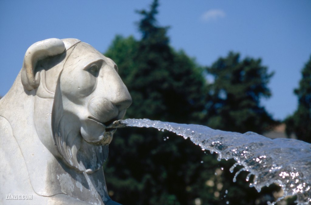 JUNE 2005 – A fountain shaped like a lion head sprays water at the Piazza del Populo in Rome, Italy, towards east. © Mark Zanzig/zanzig.com