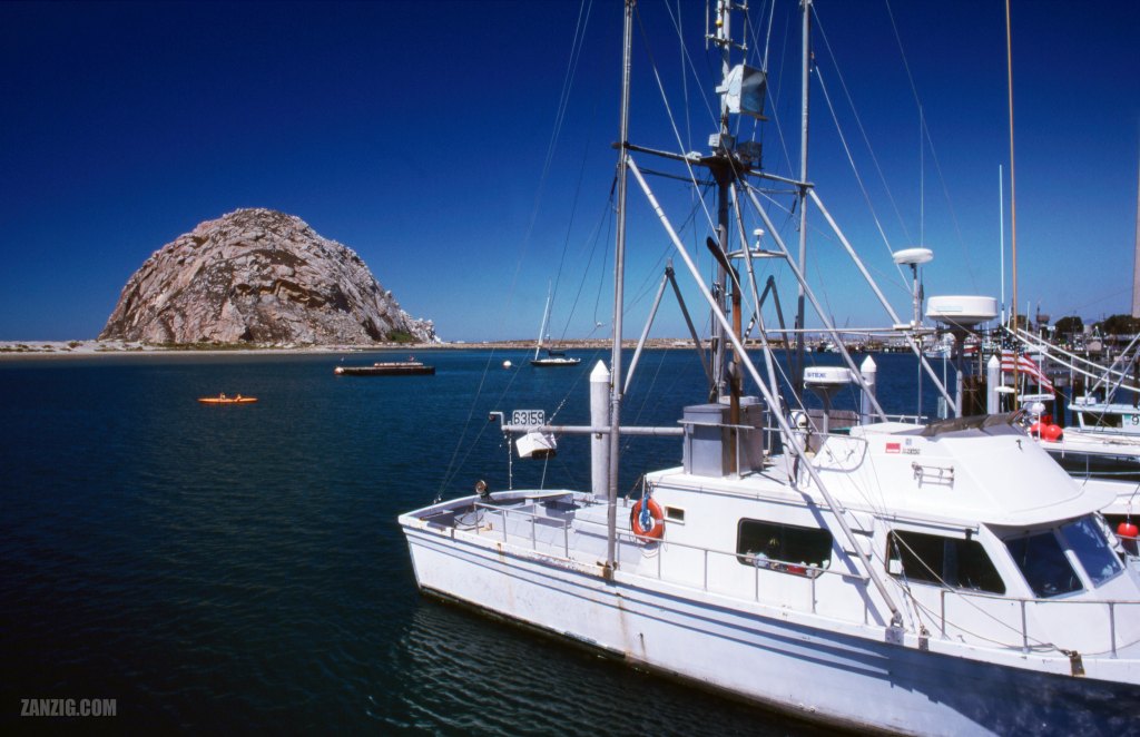SEPTEMBER 2003 – View across the harbour of Morro Bay in California, with the huge Morro Rock in the background. Photo © by Mark Zanzig/zanzig.com