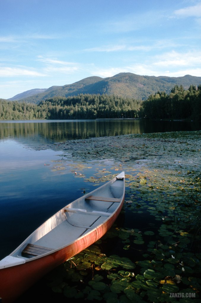 AUGUST 2002 – A red canoe rests at the shore of Dutch Lake in Clearwater, British Columbia. © Mark Zanzig/zanzig.com