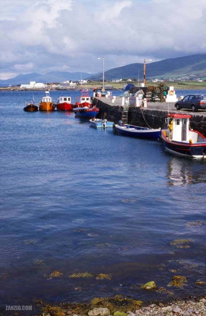 SEPTEMBER 1999 – Colorful boats have been tied to the promenade pier in Knight’s Town, Valentia Island, Co. Kerry, Ireland. © Mark Zanzig/zanzig.com