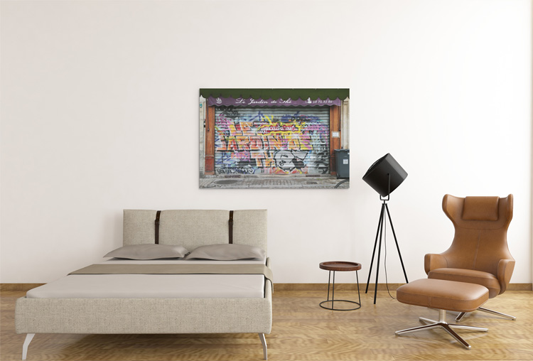MAY 2024 – Colorful grafitti decorates the roller shutters of the restaurant Le Jardin de Thé in central Paris, France. Photo © by Mark Zanzig/zanzig.com