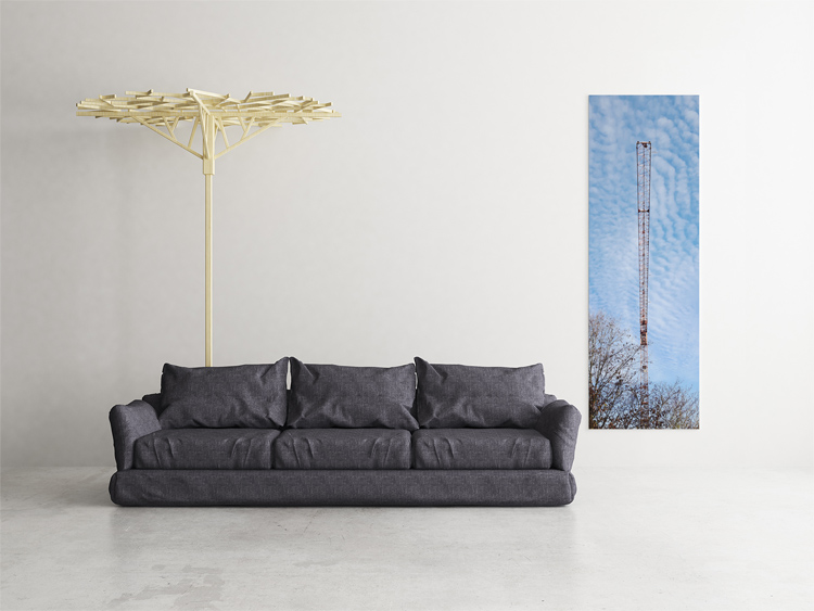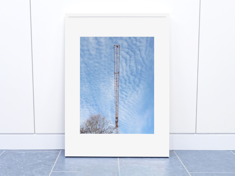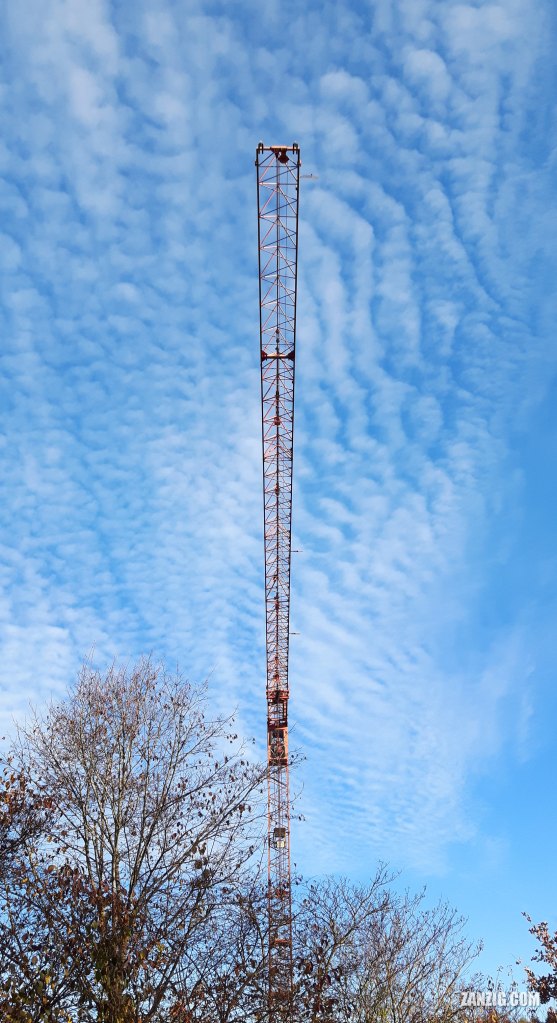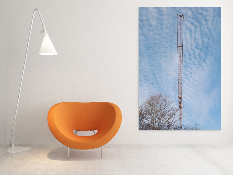 Today, I’d like to share this very graphical image: A crane boom that lurks over trees in a forest near Hohenbrunn in Bavaria. It was a beautiful autumn day with light and high clouds. We passed beneath this crane boom, and looking up I realized that it was almost perfectly dividing the image. So I tried to find an angle that put the crane boom into the vertical center (and succeeded.)