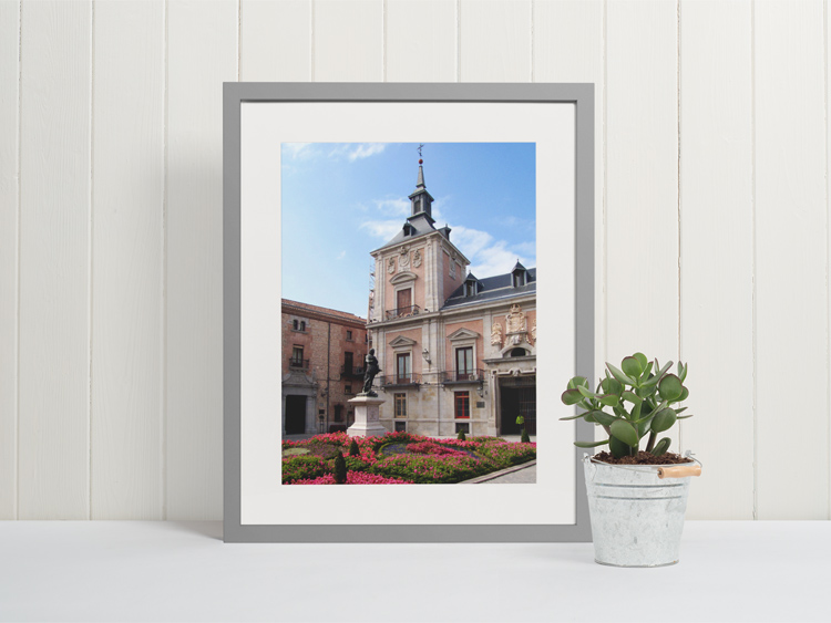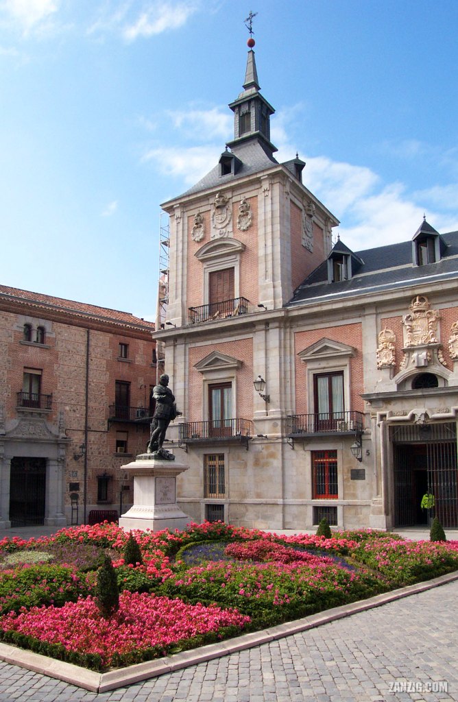 This image shows the historic city hall (Casa de la Villa) with its small courtyard and the Monumento a Don Álvaro de Bazán. Since 2011, the building is not used any longer as a city hall but still has some offices. Wikipedia has the details.
