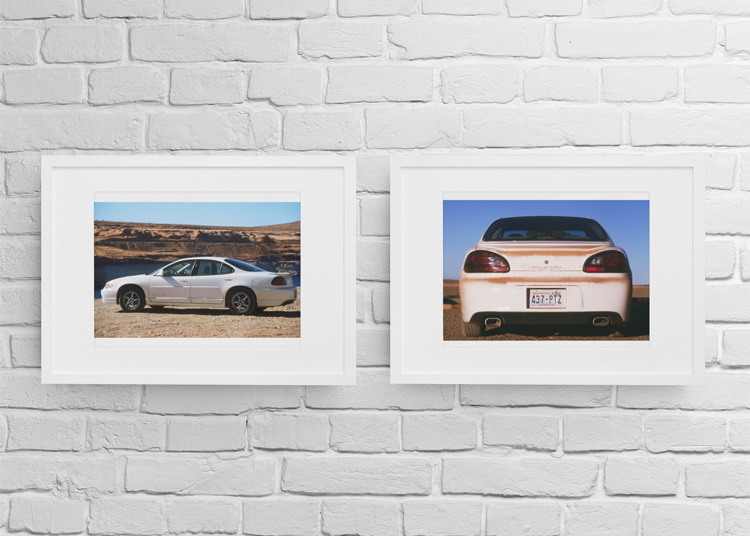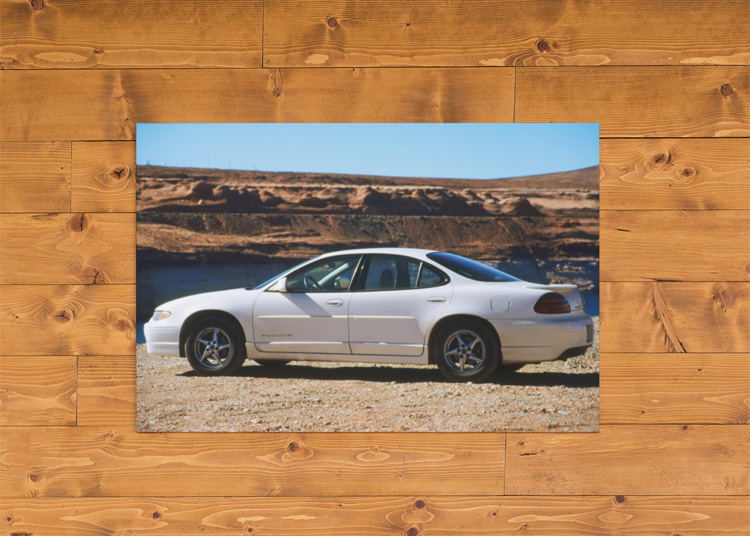 SEPTEMBER 2003 – Side view of a white Pontiac Grand Am sedan car next to Lake Powell in Arizona, USA. © Mark Zanzig/zanzig.com