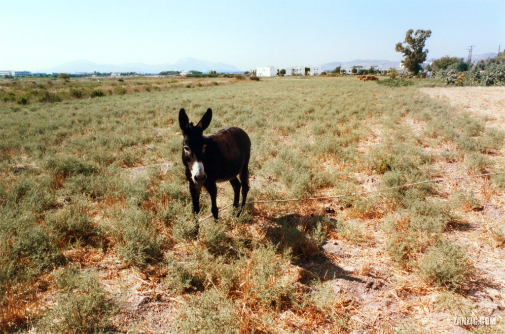 SEPTEMBER 1994 – A donkey stands on a field near Marmari Beach on the island of Kos, Greece. Photo © by Mark Zanzig/zanzig.com