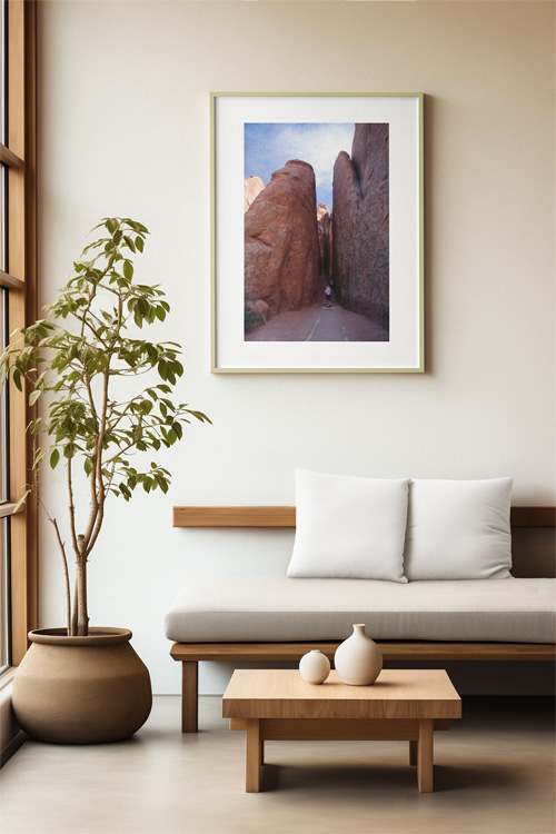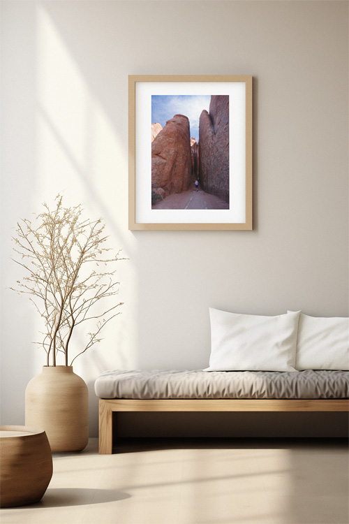 I like the way the hat, the light pink shirt and the white socks of the hiker contrast with the shadows. Also, the presence of the hiker shows the true size of the rocks.