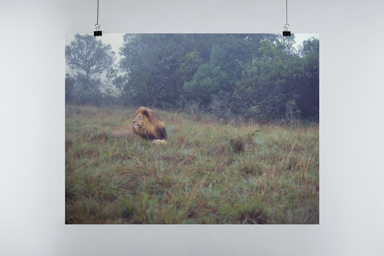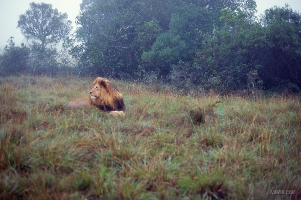 MARCH 2004 – In the beginning darkness of the night, a male lion lies in the wet grass of the Schotia Private Game Reserve in South Africa observing the surroundings. © Mark Zanzig/zanzig.com