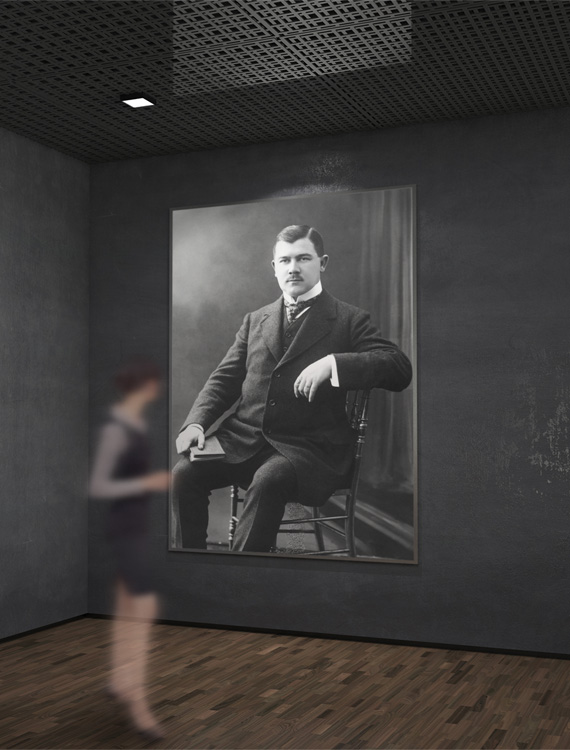 A historic undated black and white photo print shows a man on a chair in a studio. Scan © zanzig.com
