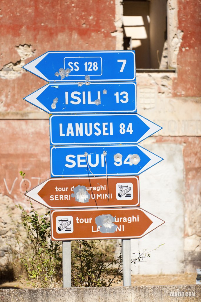 AUGUST 2010 – Road signs hit by bullets near Isili, Sardinia. © Mark Zanzig/zanzig.com