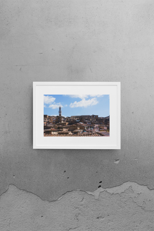 Siena is a busy town in Tuscany in Italy. It’s best known for the horse race called Palio di Siena but has a beautiful historic city center, too. This panorama shot shows the historic tower of the town hall, the Torre del Mangia, in the center, overlooking a see of appartment buildings.