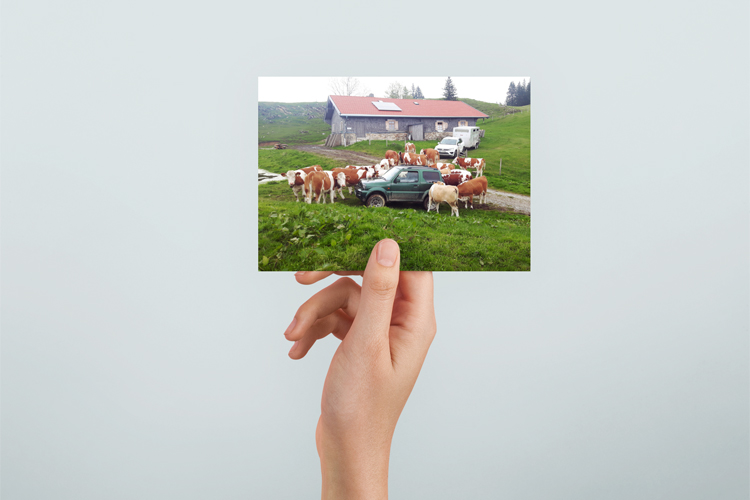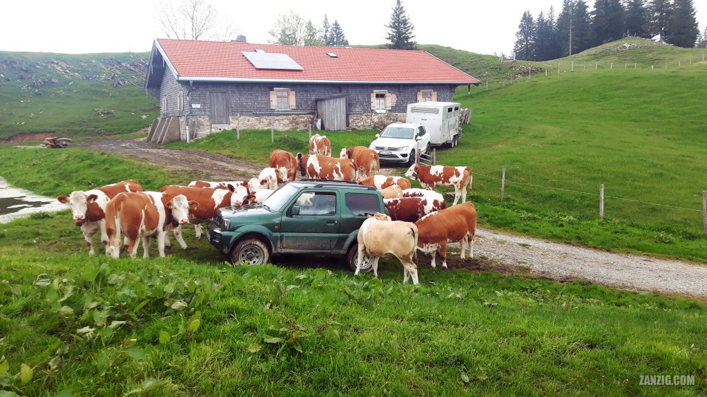 When we approached the peak we passed the Huber Alm. The farmer had parked his cars in front of the building, and his cattle herd showed great interest in the green Susuki Jimny 4×4 car. One of the cattle even rubbed his head on the bonnet.