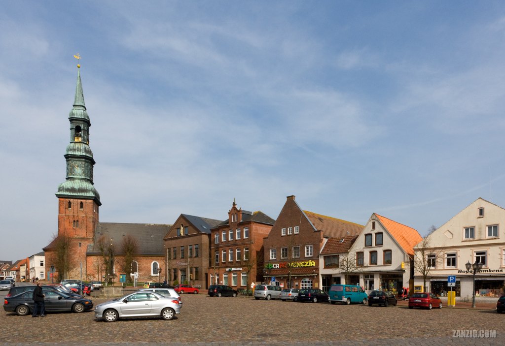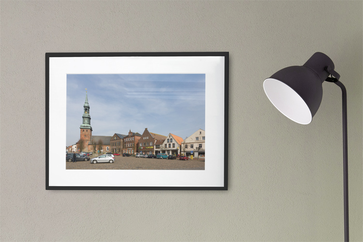 This photo shows the market place in the town center which is overtowered by the church St. Laurentius and surrounded by several smaller buildings that are typical for the region. Fortunately, Tönning could preserve its heritage and presents itself today mostly unchanged from the past.