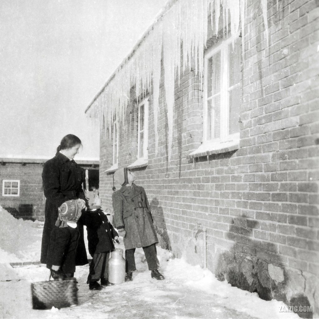 JANUARY 1945 – On a sunny winter morning, three kids stand with their nanny in front of a bungalow in Malente-Gremsmühlen, Germany, admiring huge icicles hanging from the roof. Scan © by Mark Zanzig/zanzig.com